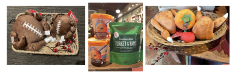 There are a variety of fun toys, including a little rubber turkey for small dogs with a hole to stuff with treats. However, the funniest items on the table are the stuffed turkey toys. They come in several sizes and some that combine Thanksgiving traditions, evoking the look of a football. If your friends or family are hosting Thanksgiving and they have a dog, don't go empty handed! Bring a stuffed turkey toy!