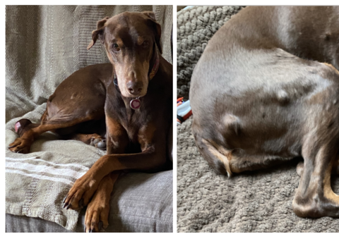| | Amazing testimonial from one of our customers. Her Doberman had a big tumor on her right back leg (look at her ankle/hock), and after using medicinal mushrooms, she sent us photos. I can't even see evidence of it now! |
