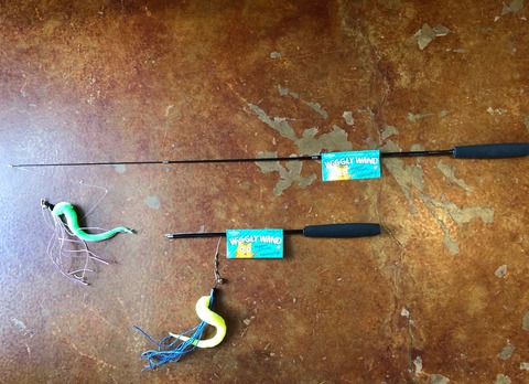 This is a neat interactive, made in the U.S.toy. These wands are telescoping, so they collapse down for storage. They have a nice padded handle and a squiggly toy which can be replaced. We carry the replacements, but other brands will also work (Like Da Bird feathers or the sparkly tassel). |
