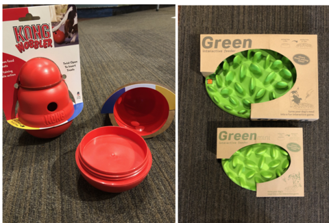 Last newsletter we told you about some of our favorite feeder toys ( (Toppl and Lickimats) that you can stuff with moist treats like applesauce, cooked sweet potato, goat's milk or peanut butter and then freeze to help to occupy energetic dogs so you can finally work from home in peace. Making their meals last longer is another great way to occupy and challenge their minds. Slow their eating down and make them work for their dry food (or treats) with the Kong Wobbler and the Green Interactive Feeder. The Kong Wobbler looks like its rubber cousin, but is a hard "Weeble Wobble" type feeding device. It opens for easy filling and cleaning, and has a heavy sand filled bottom. The dog has to bump it and tip it to get the kibbles to come out of the hole. The Green Feeder is a hard plastic feeding tray with rounded projections that make the dog have to lick out the kibble. See it in action here (Note: This feeder doesn't work well for flat faced dogs.) This feeder is tough, dishwasher safe, and comes in two sizes. Here's a homemade slow feeder idea: Get a metal muffin tin and divide the kibble between all of the holes. Flip the pan over and it's a different shape of slow feeder. Not challenging enough? Flip the pan to it's normal orientation, moisten the kibble with bone broth, goat's milk or water and freeze in the tray. A different challenge might be to stuff tennis balls into the holes so they have to pull them out before getting access to the kibble or treats. |