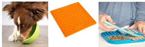 Licking can also be a form of behavioral enrichment or a way to slow-feed pets that eat raw or canned foods. Coming this month, a new line from Hyper Pet called LickiMats are here to help occupy your dog or cat. Licking can be very calming to pets, and smearing yogurt, peanut butter, applesauce, or any other moist, edible treat can be a useful tool to fight boredom on a rainy day, to occupy dogs who have trouble settling down, or for animals that over-groom or are on bedrest after surgery. They can even be frozen with the smeared treats for a longer lasting activity. Cats and dogs who eat raw or canned foods may benefit from eating from a LickiMat as a slow food "bowl." Slowing down eating is a great idea for overweight pets, as licking enhances the sense of taste and allows them to enjoy a smaller amount of food over an extended period of time. Therefore, they become more satiated with reduced portion sizes. Increased saliva production from licking can also aid digestion. Check out this video.