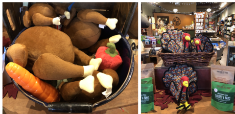Don't miss out on these fun "stuffed" turkeys! Our Thanksgiving display has a variety of nifty treats and even a delicious dog-appropriate holiday meal in a pouch that you can serve on the big day. However, the funniest items on the table are the stuffed turkey toys. The softer ones on the left come in 3 sizes, and the beautiful ones on the right are super tough and come in two sizes. If your friends or family are hosting Thanksgiving and they have a dog, don't go empty handed! Bring a turkey!