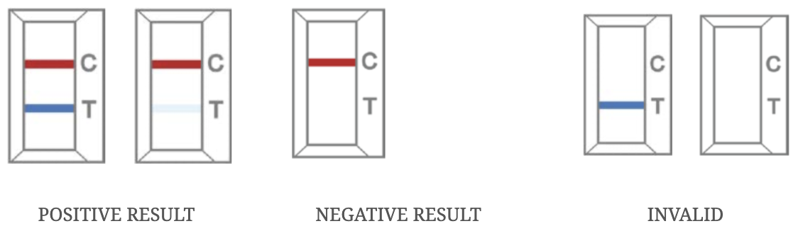 Test results are interpreted at 10 minutes. The presence of two colored lines in the control line region “C” and test line region “T” indicates COVID-19 positive. The presence of one colored lines in the control line region “C” indicates COVID-19 negative. No appearance of a colored line in the control region “C” indicates an invalid test. |