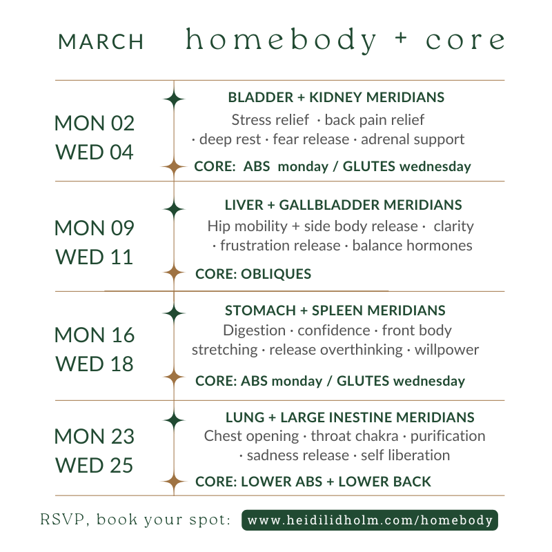 Each week we move through the meridian system intentionally building our stability and inner strength: