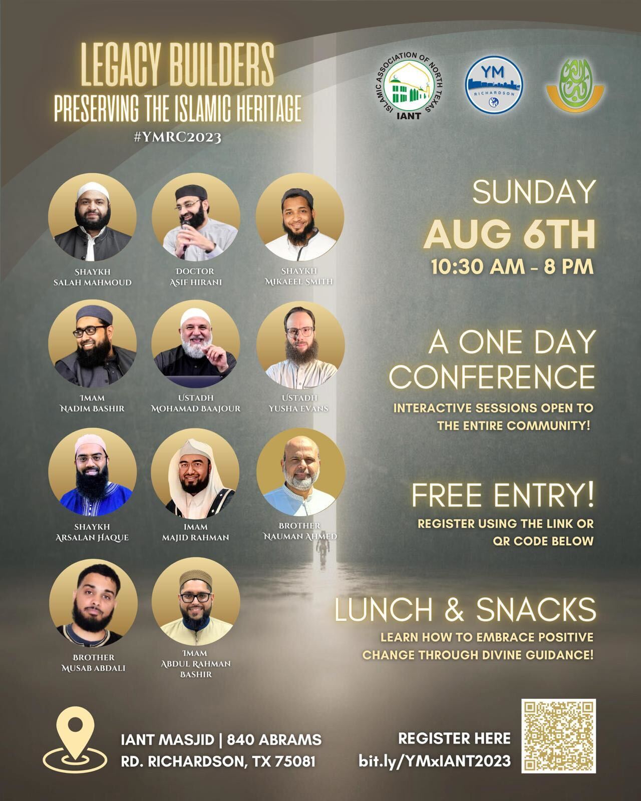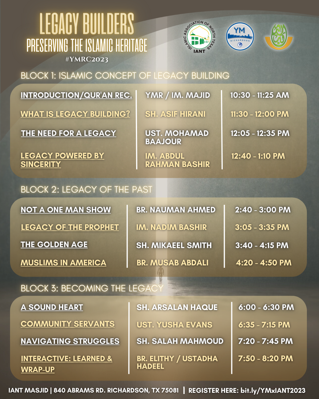 Assalamu Alaikum & Jumuah Mubarak, Friend! We request everyone to make Duaa for those who passed away and for those who are sick in our community and elsewhere, Ameen! | | | | | | | | | | | | | | | | | | | | | | | | | DEADLINE TO REGISTER IS TODAY FRIDAY AUGUST 4th, 2023! | | | | | | | | | | | | | | | | | | | | | | | | | | | | | | | | We are excited to announce this dynamic collaboration between IANT Masjid, YM Richardson, and ICNA Dallas - to bring to you our very first YM Richardson Conference! We invite you all to join us with your families and take benefit from our Islamic-work-focused programming and incredible speakers. Register now at bit.ly/YMxIANT2023! | | | | | | | | | |