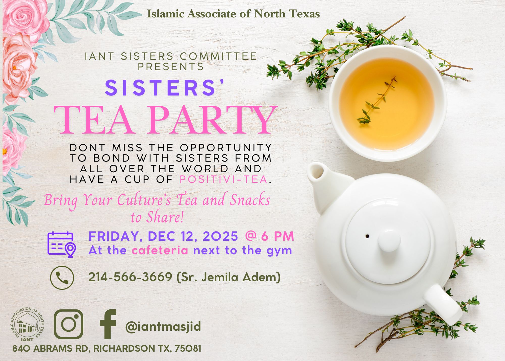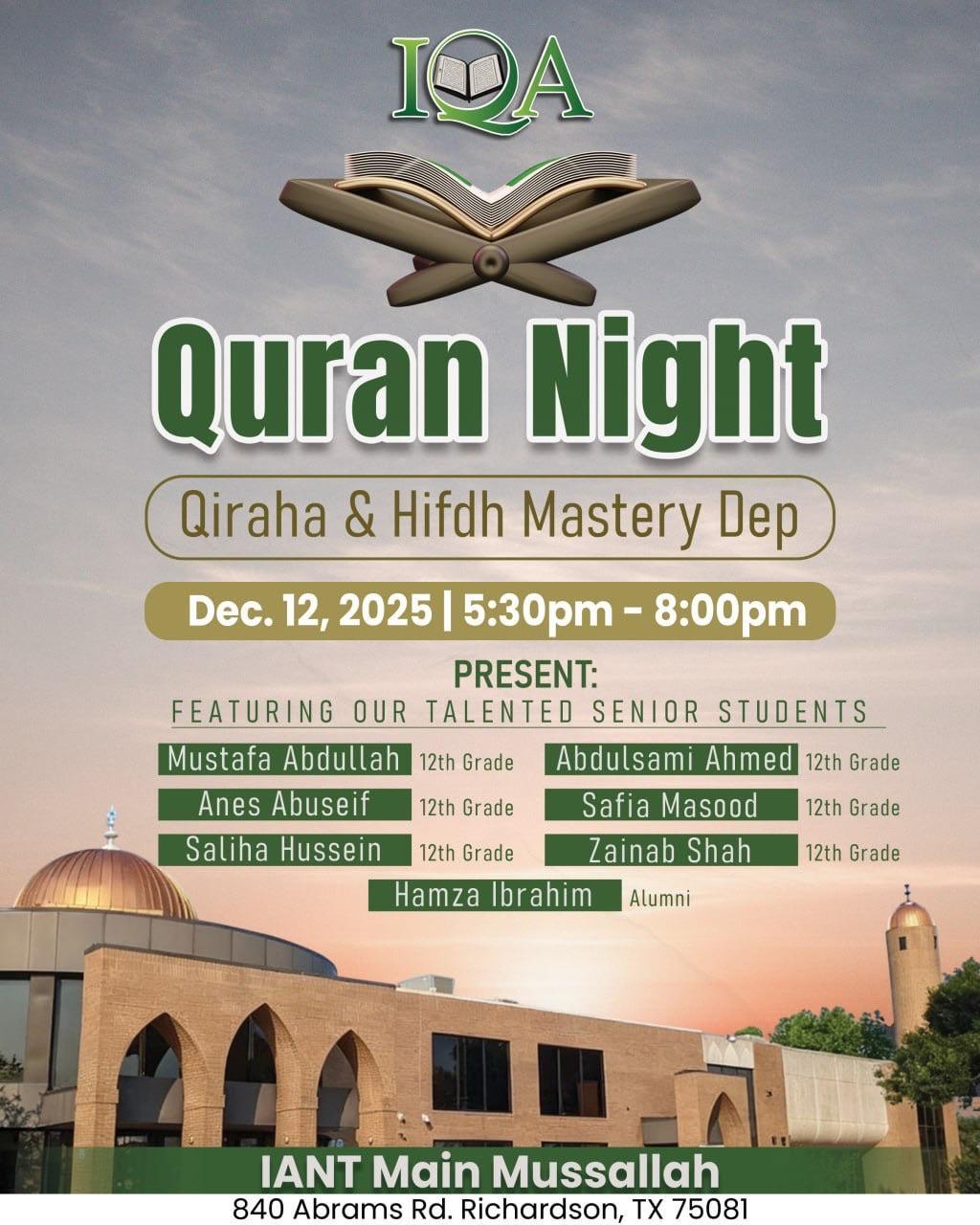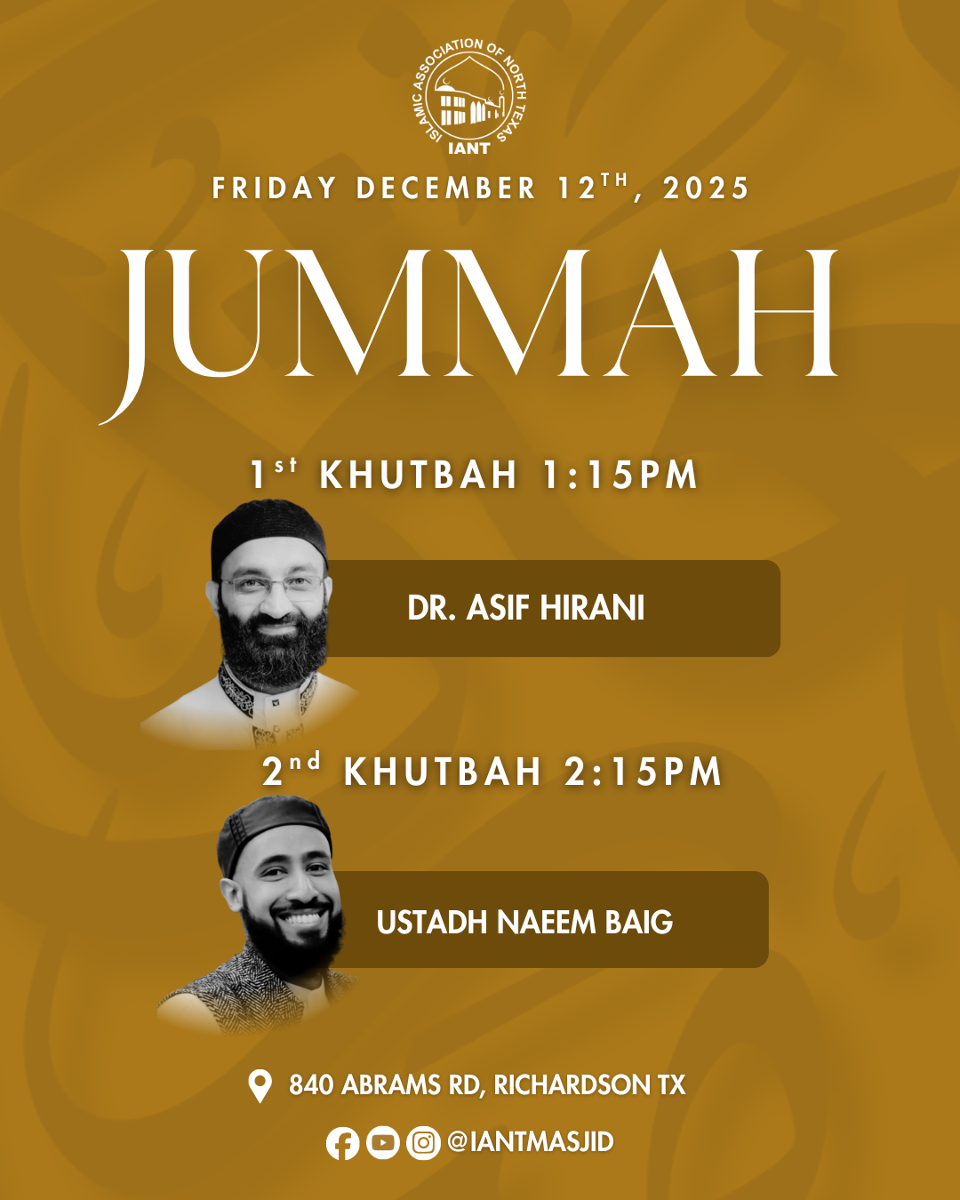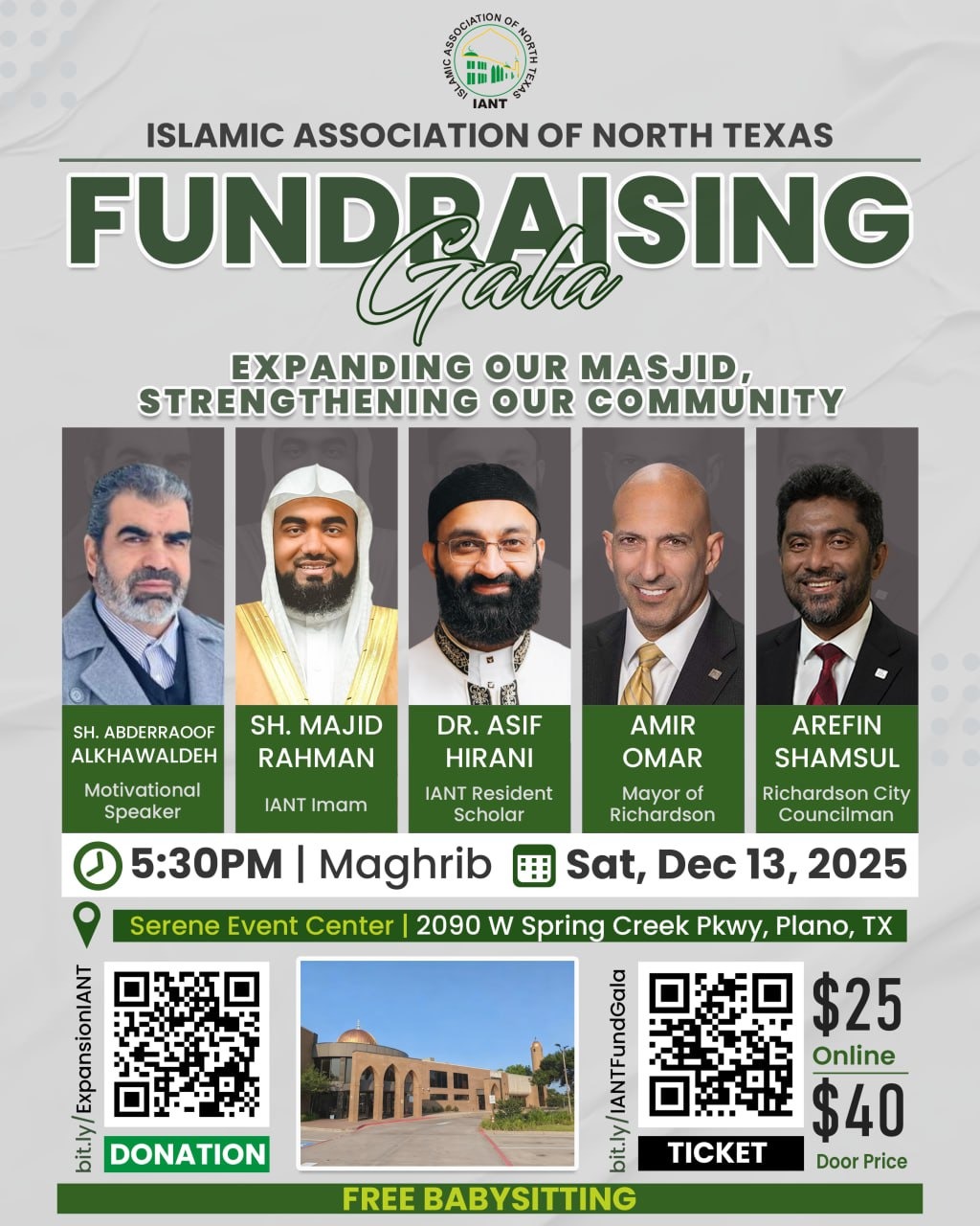 IANT FUNDRAISING GALA 2025 | Expanding Our Masjid, Strengthening Our Community The Islamic Association of North Texas (IANT)—Dallas Central Mosque and one of the oldest and most respected masājid in the DFW Metroplex—warmly invites all masājid, organizations, and community institutions to a historic evening dedicated to strengthening our community and shaping its future. As our community continues to grow, so does the need to expand our masjid. This year’s gala launches a major initiative to expand IANT so we can better serve our families, youth, students, and future generations. Join us for an inspiring evening focused on unity, growth, and creating a stronger future for our beloved masjid. 🗓 Saturday, December 13, 2025 🕠 5:30 PM | Maghrib 📍 Serene Event Center 2090 W. Spring Creek Pkwy, Plano, TX 75023 🎟 Tickets: • $25 Online: bit.ly/IANTFundGala • $40 At the Door 💚 Support the Expansion Project: Donate here: bit.ly/ExpansionIANT ✨ Free Babysitting Provided Come be part of this vital effort to uplift and expand our beloved IANT. Your presence truly makes a difference. We look forward to seeing you on December 13, in shā’ Allah. |