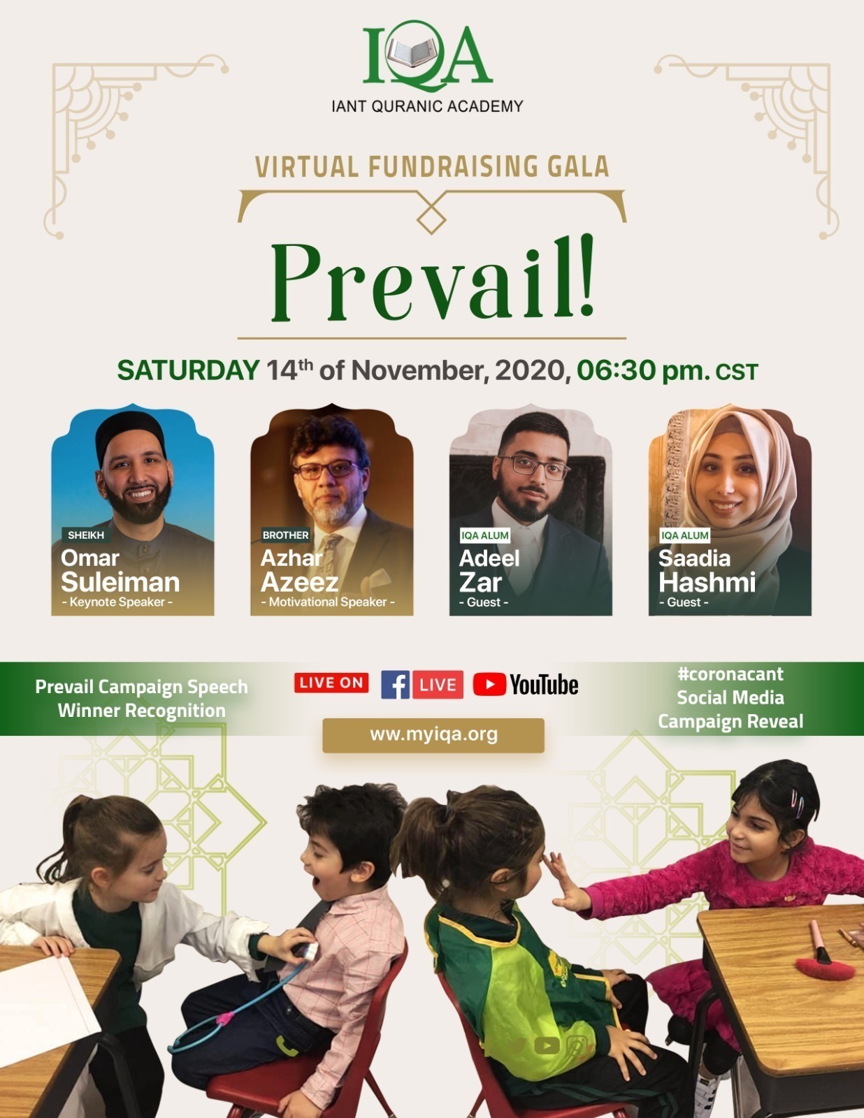 The IQA staff, students, and Management Committee (MC) would like to invite you to attend our 2020 Virtual Annual Fundraiser Gala. The event provides you a chance to meet (virtually) IQA alumni and to hear from local scholars speak about the significance of Islamic education and the need to support IQA to continue providing exemplary services aligned with its mission of “Developing the Next Generation of American Muslim Scholars”. This year’s guest speakers include Sheikh Omar Suleiman(Ph.D.) and Br. Azhar Aziz along with IQA alumni Br. Adeel Zar and Sr. Saadia Hashmi. The event also features beautiful Quran recitation and speeches by our current students. We hope you will join us and enjoy the event. 6:30 pm Saturday, November 14, 2020