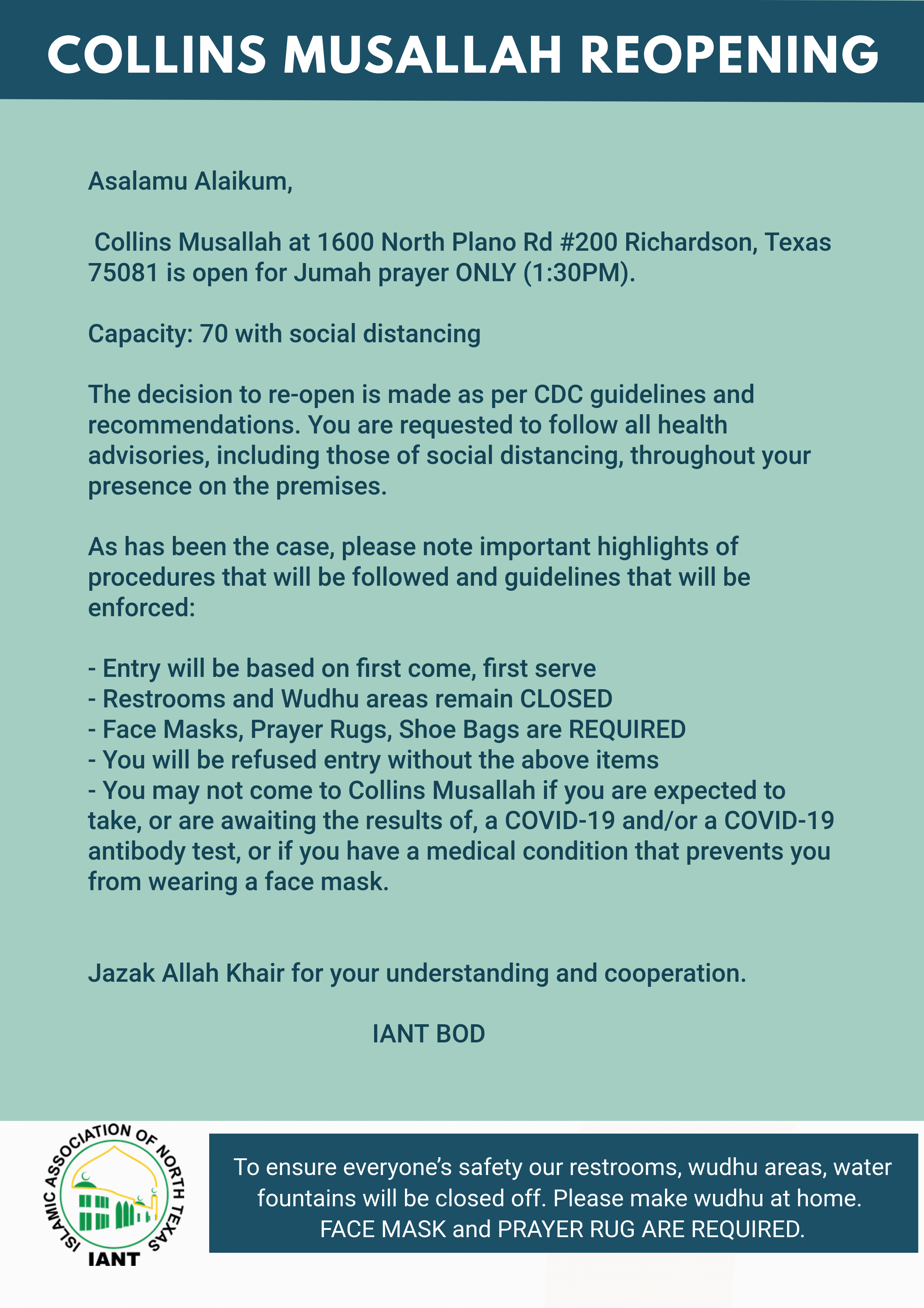 We request everyone to make Dua for those who passed away in this community, their relatives or loved ones here or abroad and those who may be sick or suffering. We ask Allah (SWT) for his forgiveness and to help us eliminate this pandemic quickly. Ameen
