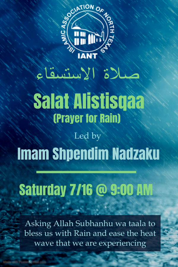 IANT will be holding Salat Alistisqaa (Prayer for Rain) Saturday 7/16 at 9:00 AM. Please watch the video in the link below from Imam Shpendim inviting the community to participate in this prayer.