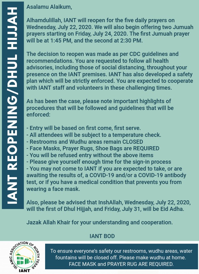 Assalamu Alaikum and Jumuah Mubarak! Alhamdulillah, by the grace of Allah subhan o talla, IANT is open for Jummah Prayers.  In Shaa Allah, IANT will host 2 prayers as follows:     1st Prayer  at 1:45 - will be lead by Imam Shpendim Nadzaku   2nd Prayer at 2:30 - will be lead by Sheikh Saad Hassanin     Please be mindful of social distancing and follow all IANT safety instructions as noted below.       P.S. If you haven't already, make sure to sign up for our free* texting service! Simply send @iantmasjid to 81010, or 415-704-8328.   *Standard message rates may apply. Check your carrier for details. .  |
