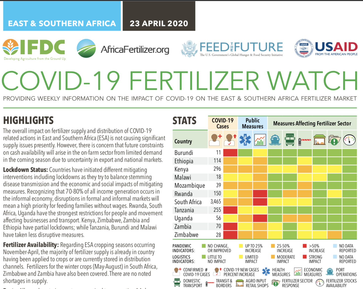 In response to the COVID-19 pandemic, the International Fertilizer Development Center (IFDC) and our AfricaFertilizer.org initiative have launched a weekly update on fertilizer trade information. The East and Southern Africa COVID-19 Fertilizer Watch will be available by subscription, starting Thursday, April 23. This one-page document will specifically track the impact of government-sanctioned COVID-19 interventions on the delivery and use of fertilizers in African countries and, in doing so, will allow public and private sectors to monitor agricultural production and food security in the region.
