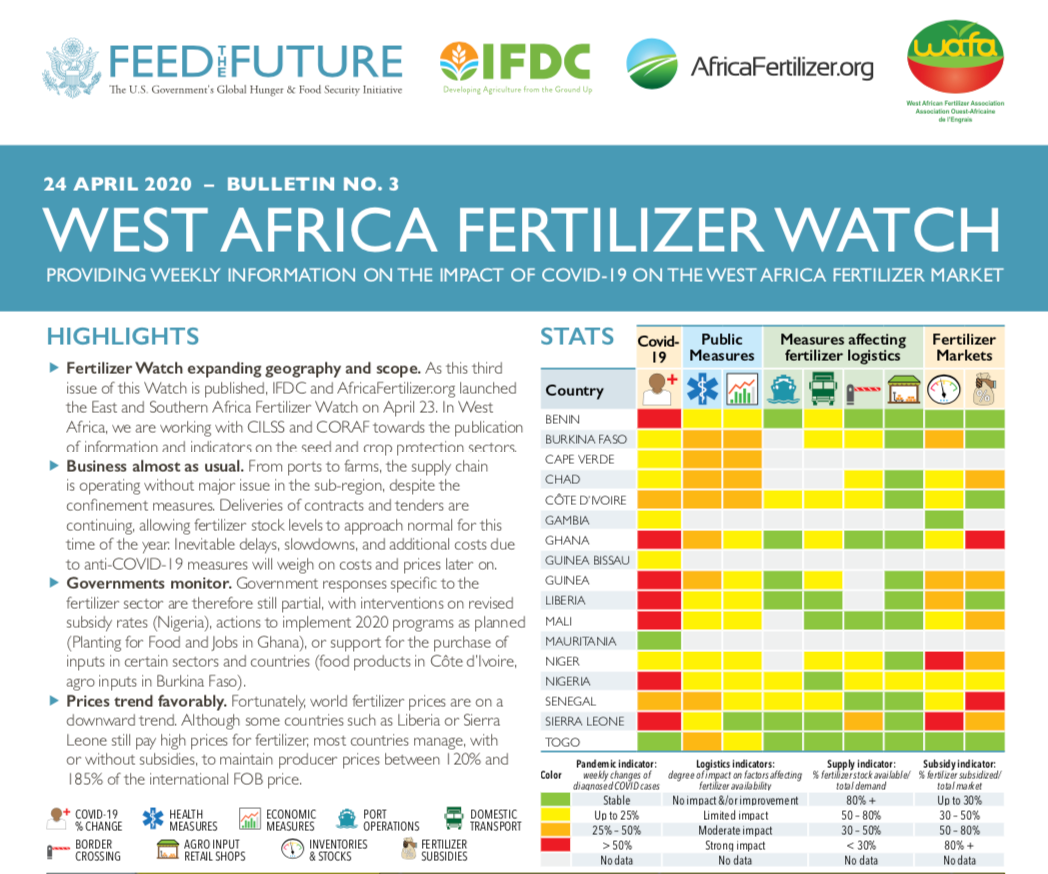 The Fertilizer Watch is designed to provide weekly updates to stakeholders throughout ECOWAS countries, including Chad and Mauritania, using data collected around 10 indicators. These indicators are related to a variety of information such as the spread of COVID-19, measures taken by country governments, and logistical constraints that affect fertilizer flows. The goal is a well-informed and prepared fertilizer supply chain, where actors can use the information to plan accordingly and ensure consistent delivery to farmers. |