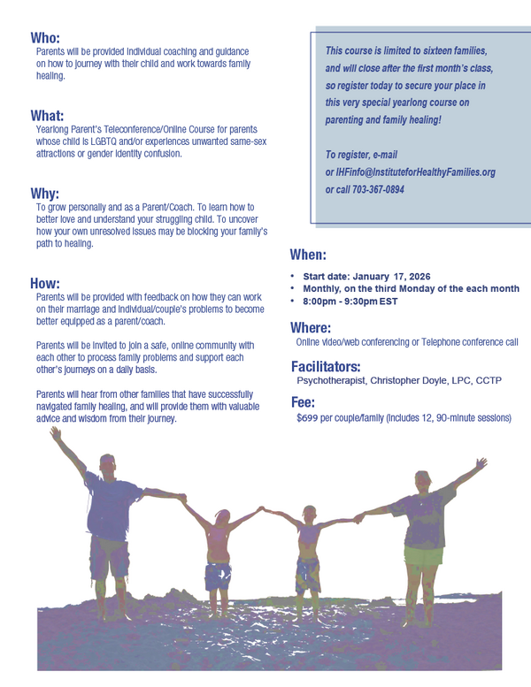 Institute for Healthy Families (IHF) specializes in counseling solutions for individuals, couples, families, therapists, and ministry leaders. IHF is a 501 (c) (3) non-profit therapeutic organization located in the Washington, D.C. metropolitan area. As a Judeo-Christian organization, IHF believes that the family is the foundation for healthy individuals, relationships, communities, and places of worship. While IHF is non-sectarian, we believe that God reveals His truth in both the Bible and Creation and that we can use this wisdom to help facilitate healing. IHF believes that through this synthesis of science and faith, we can help our clients form and maintain healthy families that will be able to help their children become the best versions of themselves and fulfill God’s will for their lives. For more information, visit our website at: www.InstituteforHealthyFamilies.org. |