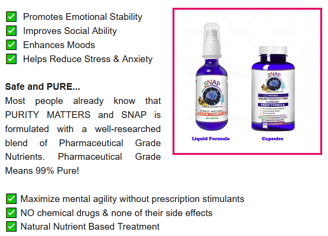 Guess what? SNAP Nutrients is helpful for children, teens and adults! Are you a stressed-out Mom? Try SNAP, you're patience level will increase dramatically. Are you a Dad that gets angry too often? Try SNAP, you'll be much less confrontational.