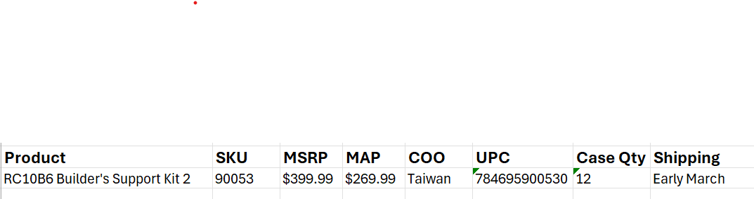 Please find the information below for the new RC10B6 Builder's Kit 2 (90053). It's the successor to 90033. Please keep confidential until release, likely later this week. You'll find the features and listing information below. You can pre-order NOW by replying to this email. Please let me know if you have any questions.
