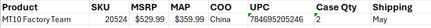 Please find the pre-order information for the NEW MT10 Factory Team Kit below. Please keep confidential until actual release.
