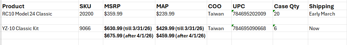 The YZ-10 Classic is a YZ-10 infused with RC10 elements. It does include the body, tires and wheels, but they aren't pictured. There will be lower introductory pricing, which will then escalate to regular pricing.