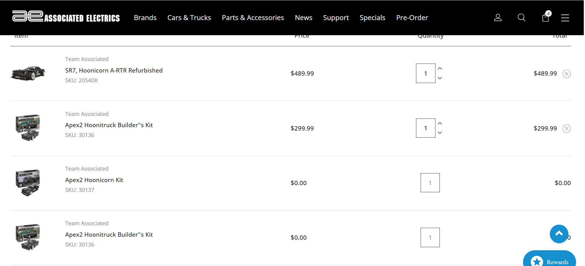 Buy a Hoonitruck Kit (30136), get a Hoonicorn Kit (30137) FREE. This is a $300 savings. Simply login to your AE account, put 30136 into your cart, and 30137 will appear for FREE. Buy an SR7 R (20540R) for $489.99, get a Hoonitruck Kit (30136) FREE. The SR7 R says "refurbished," but it's never been driven. It includes the car, servo, radio system and motor (no ESC/battery). Same process as above: login, put 20540R into your cart, and 30136 will appear for FREE