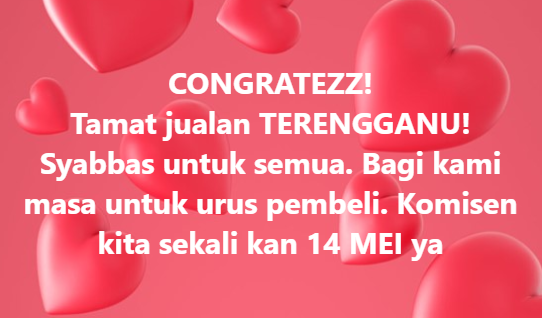 Terima kaseyyyy! Macam mana layan kerenah pembeli kali ni? Penat sikit kan? Stamina kurang dah tu. Kurang Vitamin C 😆 Untuk sahabat affiliate asal Terengganu, syok sikit la. Layan calon Terengganu dekat di hati hohoho. Kami memang jemm sikit. Takut silap respon bawa maksud lain. Kalau loghat Utara kami A+ ! | |