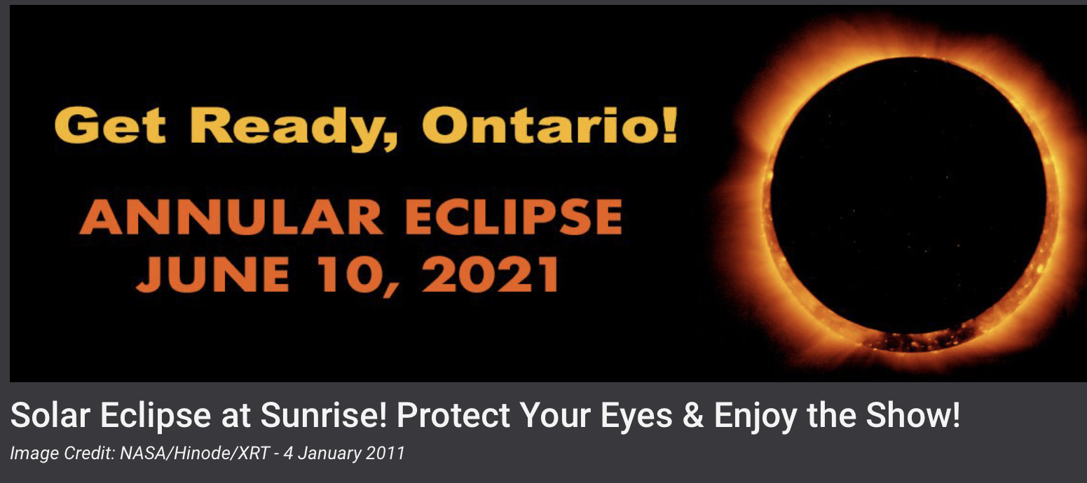 On June 10, 2021, an annular solar eclipse begins at sunrise in southern Ontario, Canada. The Moon’s shadow touches down on the northern section of Lake Superior and crosses portions of three countries; Canada, Greenland, and Russia. The full annular eclipse will be difficult to see in Canada due to many obstacles, however the best places to try your luck will be South Ontario above Thunder Bay and the west shore of Lake Nipigon. Assuming the weather is with you, this "ring of fire" eclipse will be seen rising from the horizon...a wonderful photographic opportunity!