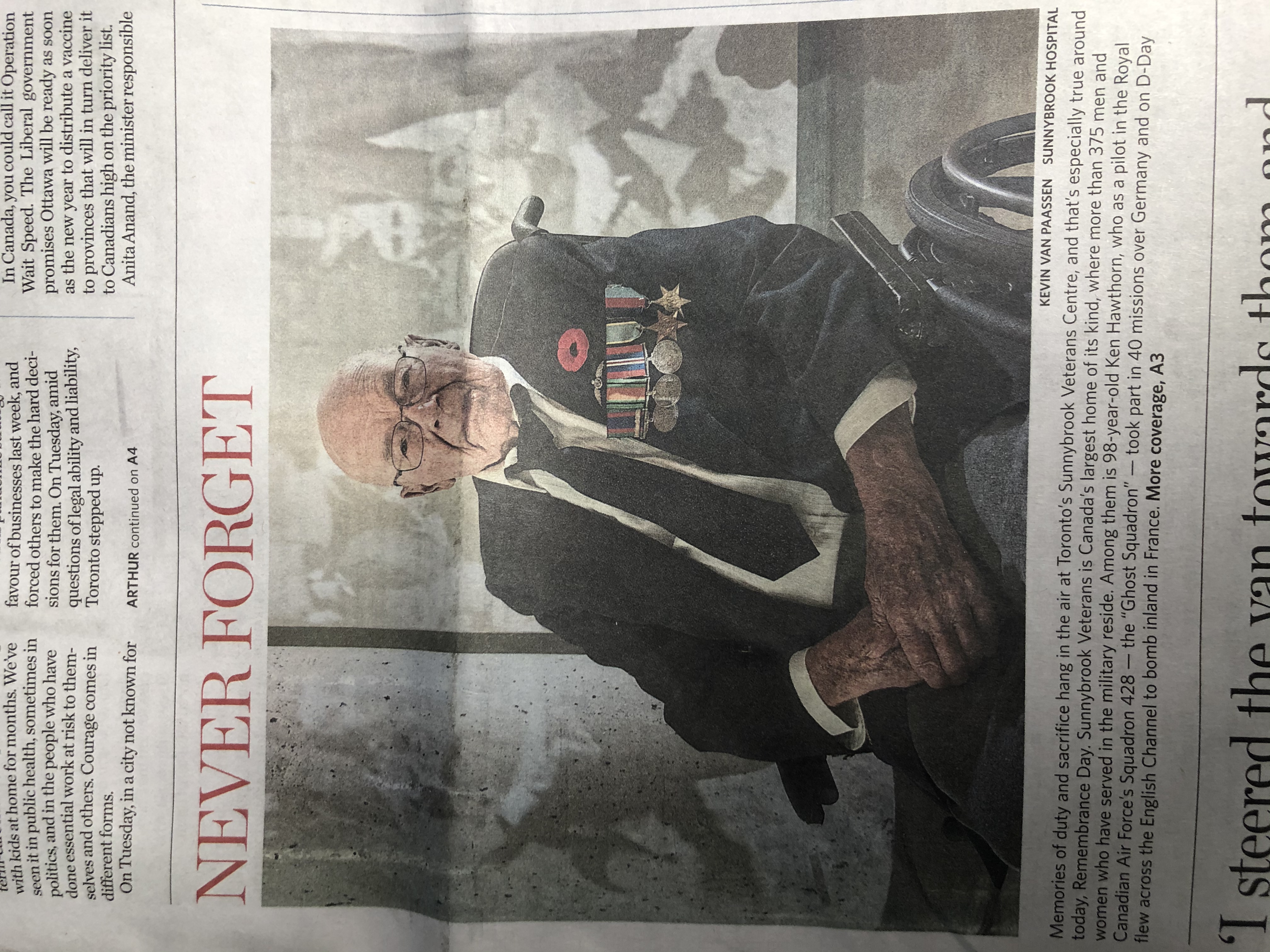 This is the Front Cover of Today’s Toronto Star Newspaper. Featured is 98 year old Ken Hawthorn. He service in the Canadian Air Force’s Squadron 428- also known as the “Ghost Squadron”. He took part in over 40 missions over Germany and also flew on D-Day across the English Channel to bomb inland in France. Thank you to Ken and all the Veterans who served to protect and preserve our freedoms. Ken made it back; so many others didn’t . I’m forever grateful . Clear Skies, Ray Khan PS Ken is the father of my better half. |