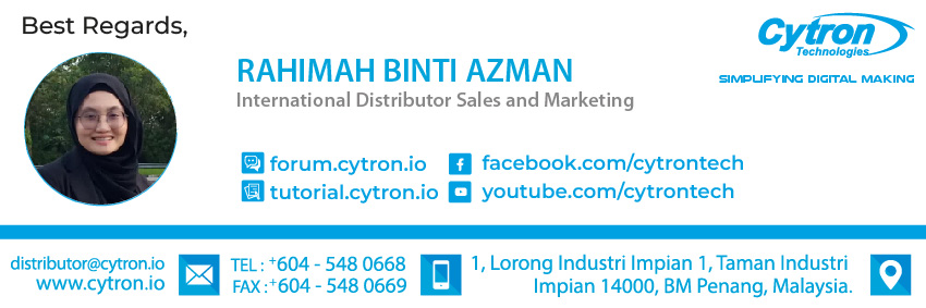 I hope this email finds you well. I am Rahimah from Cytron Technologies. We are excited to reach out to you with a fantastic opportunity to join our team as a valued distributor. Cytron Technologies is a Malaysian-based company that specializes in providing electronic components, modules, and accessories for robotics and electronics projects. If you are interested, we are giving the best price and service. Which parts do you need? Please feel free to visit our website at www.cytron.io email me at rahimah@cytron.io or our team sales@cytron.io, so that we can check the stock for you.