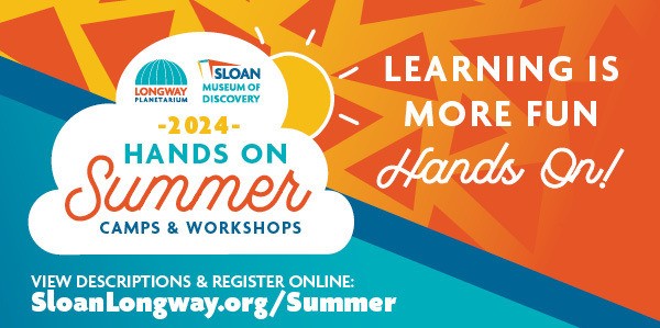 | | The 2024 Summer Camps & Workshops have just been announced! Through engaging workshops and day camps at Sloan Museum of Discovery and Longway Planetarium, the kids will be learning all summer long while having fun and meeting new friends. Workshops in STEM and social studies are for ages 4-5, 1st-3rd graders, 3rd-6th grader's 5-day Camp Alpha Omega for Girls, 4th-6th graders, 5th-8th graders, and 7th-12th graders. Go to SloanLongway.org/Summer to register and see a complete roster of workshops and day camps, or click on the links below for the specific workshops by grade. Grades listed are the grades students are entering in Fall 2024. Happy Camping! |