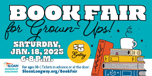 | | Do you fondly recall the days when the Scholastic Book Fair came to school and you were excited all day long just to READ? We do, too, so we created a Book Fair for Grown-Ups just for you! Come on by Sloan Museum this Saturday, January 18, 2025, 6-8 p.m. for this 18+ book fair that has more than just books.