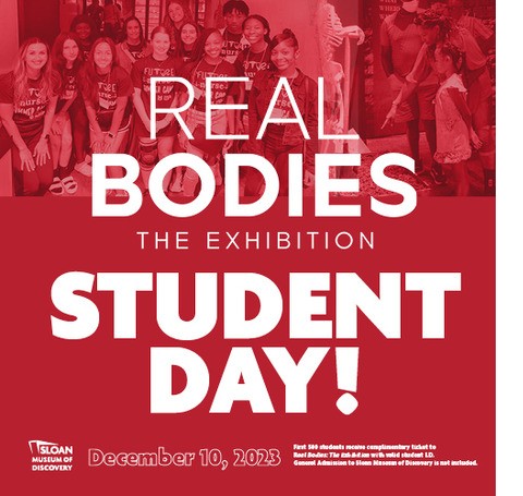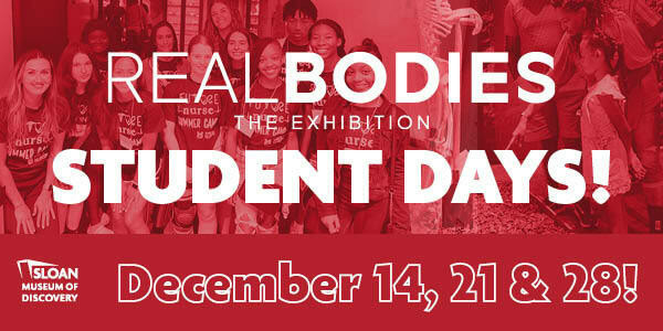 Student Days* have been extended! 500 students over next three Thursdays will get in to see REAL BODIES at no extra charge on the following dates: December 14 from 10 a.m.-8 p.m.; December 21 from 10 a.m.-5 p.m., and December 28 from 10 a.m.-5p.m. (last entry to the REAL BODIES exhibit is 45 minutes prior to closing time)! These free REAL BODIES exhibition tickets are courtesy of Senator John Cherry, Flint Mayor Sheldon Neeley, and Representative Phil Green.