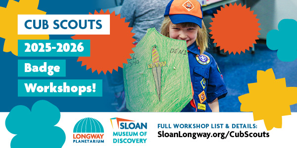 Book Your Cub Scout Program Early!Cub Scout overnights and workshops at Longway Planetarium and Sloan Museum of Discovery create unique, memorable and educational experiences that last a lifetime! The Sloan and Longway education team has created Cub Scout programs for Lion Cub, Tiger Cub, Wolf Cub, Bear Cub, Webelos, and Arrow of Light troops from October 2025 through May 2026. Reserve your scouting program by emailing or calling our reservationist, Kristina Jimmerson, at (810) 237-3409, or check out all the Cub Scout programs and easily book it online! | | |