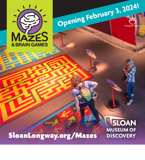Mazes & Brain Games opens to the public in Sloan Museum of Discovery's FUN Gallery on February 3 (free Member Preview will be on on Fri., Feb. 2, 6-8 p.m.). Mazes & Brain Games winds its way over 5,000 square feet with over 60 puzzling experiences that inspire exploration and ingenuity. Great for multi-generations of family members to enjoy together! Learn more at SloanLongway.org/Mazes. The exhibit entry fee is just $5 per person, plus general admission (free entry for Members). The exhibit will run through May 19, 2024. Buy tickets in advance here, or in person at guest services. |