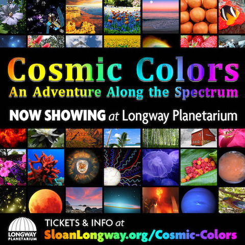 Cosmic Colors Premiered June 1 at Longway This new educational and fun show kicked off June 1. Discover the many reasons for color—like why the sky is blue and Mars is red. Take a tour within a plant leaf and journey inside the human eye. Investigate x-rays by voyaging to a monstrous black hole and then back to your doctor's office. You will even see the actual color of a dinosaur—based on recent evidence. Learn more at SloanLongway.org/Cosmic-Colors. Buy tickets here. |