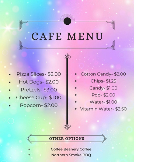 1. Doors will open at 6:30 p.m. for beverage and food purchases in advance of the event. The special bar and cafe' menus are shown below for your planning purposes.