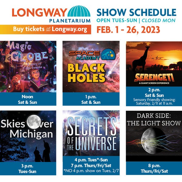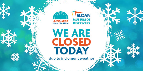 | | | Due to the current road conditions and for the safety of our staff and guests, Longway Planetarium will be closing at 1 p.m. today, Wednesday, February 22, 2023. We apologize for any inconvenience. If you have purchased tickets for today's 4 p.m. show, you will be issued a refund. At this time, we are planning to re-open on Thursday with our regularly-scheduled planetarium show schedule, but recommend that guests please check our Facebook page or www.Longway.org for updates before arriving. Complete show schedule and tickets, go to SloanLongway.org/Now-Showing. |