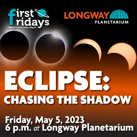 | First Fridays: "Eclipse: Chasing the Shadow"(Live format; a special First Friday presented by Sloan and Longway's Executive Director Todd Slisher showcasing his personal eclipse-chasing photos and journeys, and how to find the best spots to see the next total solar eclipses)