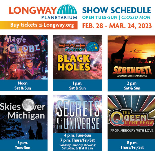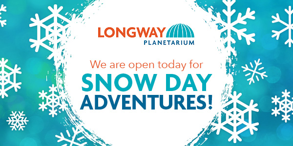 | | Longway Planetarium is open with our regular show schedule today, starting at noon! Tickets can be purchased at www.SloanLongway.org/Now-Showing, or in person at guest services. For a snow day treat, head across the street to Sloan Museum of Discovery, which is also open at Noon today! |