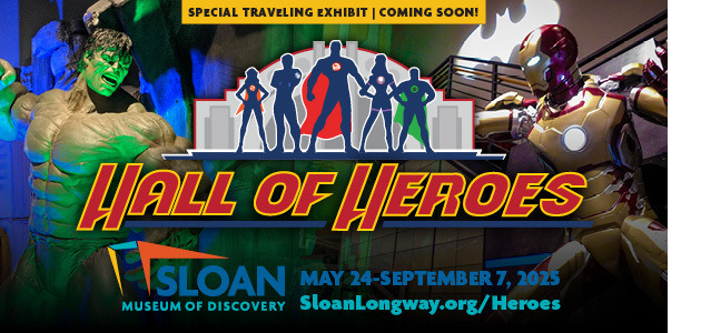 Sloan Museum of Discovery opens their newest special traveling exhibit, Hall of Heroes, on May 24, 2025, in the FUN Gallery exhibition hall. Hall of Heroes brings guests into the world of superheroes, crime-fighters, gadgets, and spies through an immersive experience.