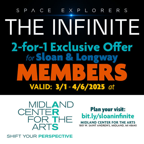 Now through April 6, 2025, members of Sloan Museum and Longway Planetarium receive 2-for-1 ticket pricing to see "Space Explorers-The Infinite" at Midland Center for the Arts. Regularly priced tickets are $37/Adult on weekends ($35 weekdays). Your Sloan/Longway membership will allow you 2-for-1 pricing to see this extraordinary virtual reality immersive experience that puts you on the International Space Station to explore breathtaking views of Earth and a day in the life of the crew.
