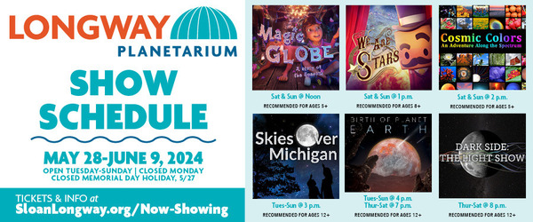 Check out Longway Planetarium's new shows and schedules in June, just in time for summer break. We've got animated shows for little ones, live astronomy shows for fans of the night sky, and full dome features for everyone in between. For an up-to-date list of shows and tickets, go to SloanLongway.org/Now-Showing. Note: please keep in mind several special events taking place on the grounds of Longway Planetarium in June...Juneteenth's Spotlight @ The Flint Cultural Center will feature live music, vendors and food trucks on June 15, 11 a.m.-4 p.m., and on June 22-23, 2024, the Sloan Museum Auto Fair will be in full swing. During those special events, E. Kearsley Street between Walnut and Crapo Streets will be closed off to cars but access to the Planetarium parking lot is available from Robert T. Longway Blvd. to Walnut Street. |