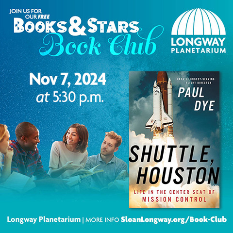 | | Books & Stars Book Club Thurs., Nov. 7 5:30 p.m. Location: Longway Planetarium, 1310 E. Kearsley St., Flint November's featured book: Shuttle, Houston: Life in the Center Seat of Mission Control, by Paul Dye |