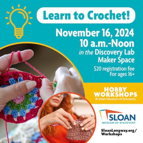 Sat., Nov. 16 10 a.m.-Noon for ages 16+ Located inside Sloan Museum's Discovery Lab maker space. Cost: $20. Space is limited. Register here or call (810) 237-3450. This is the first of Sloan's new Hobby Workshops for adults! Learn the basics of crocheting, simple terminology, and how to read and follow a crochet pattern. You'll be given time and instruction to work on a simple project to take with you, along with a few crochet tools to continue your new hobby at home. Learn more. |