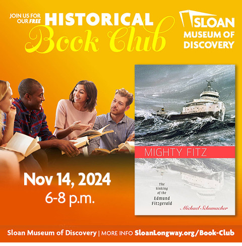 Thurs. Nov. 14 6 p.m. Location: Sloan Museum FREE! November's featured book: Mighty Fitz: The Sinking of the Edmund Fitzgerald, By Michael Schumacher |