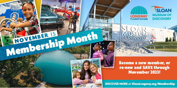 | | Renew or Buy a New Membership November 1-30 and SAVE $! November is Membership Month at Sloan Museum of Discovery and Longway Planetarium! Buy a discounted membership as a gift for a science and history lover, or for yourself, throughout November and save!