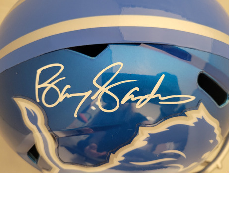 Online auction Item #26: a Barry Sanders signed Detroit Lions Football Helmet. |