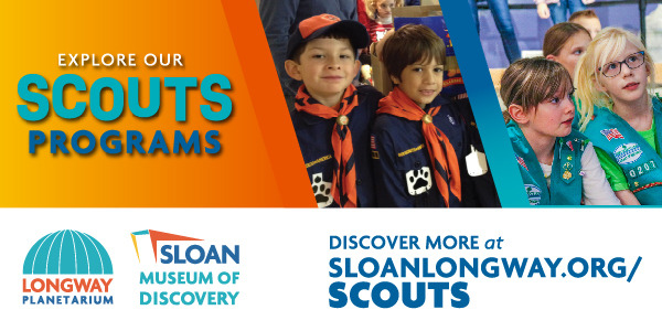 Participation in Scouting positively impact girls and boys far beyond their one day workshops or overnights. Curiosity is ignited. Friendships are created. Confidence and skill-building are sealed for a lifetime. With that insight in mind, the Sloan and Longway Education team has been curating memorable workshops, overnights, and fun nights for Girl Scouts, Boy Scouts and Cub Scouts for decades. If you're looking to ignite some curiosity and build confidence, check out the upcoming scouting programs below. For a complete list of scouting programs and to register online, go to SloanLongway.org/Scouts. To discuss details, you may also email Reservations@SloanLongway.org, or call our scheduler at (810) 237-3409.