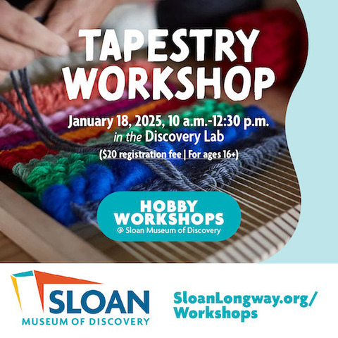 Sat., January 11, 2025 10 a.m.-12:30 p.m., for ages 16+ Learn to make your own tapestries in this hobby workshop. Participants will learn about the tools and techniques used in the craft. You'll be given a loom and tools of your own to make a personal take-home project. For ages 16 and up. Cost: $20. Space is limited. Register here or call (810) 237-3450. Learn more. Reserve your space by January 15 here. |