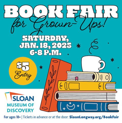 | Book Fair for Grown Ups Sat., January 18, 6-8 p.m. for 18+ Featuring new and used books from local book sellers R & B Books, Scholastic Books, and other vendors. Make your own bookmarks, buy a new book to start, or bring an old book to finish! Find a gift for yourself or for someone else! Cash Bar with food, drinks and snacks available for purchase at the Coffee Beanery Café. Bonus! The entire museum will be open to explore after hours! $5/person at the door, or buy tickets in advance here. |