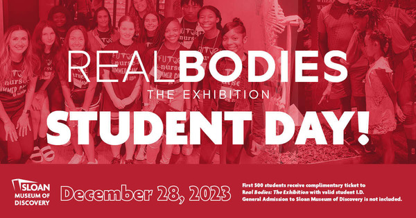 (*no-charge REAL BODIES Student Day tickets available in person only at Guest Services; up to 500 Student Day tickets total will be given away at no-charge; after 500 tickets have been given away, standard REAL BODIES exhibit entry fees will go into effect. Students of all ages with student I.D. are eligible; minors under the age of 18 must be accompanied by an adult; up to two accompanying parents or guardians may also get admission to the REAL BODIES exhibit at no extra charge, a savings of up to $8 per person; accompanying adult(s) and student will pay applicable General Admission fees to Sloan Museum of Discovery which allows entry to the entire museum; Genesee County Residents receive free General Admission to Sloan Museum due to the Arts Education and Cultural Enrichment Millage; school field trip groups are not eligible for no-charge admission to Real Bodies exhibit).