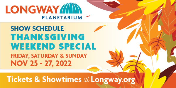 We are closed on Thanksgiving Day, but OPEN Friday, Saturday and Sunday this weekend with a special new show schedule. Plus, a sneak peek at some upcoming special planetarium programs in December. |