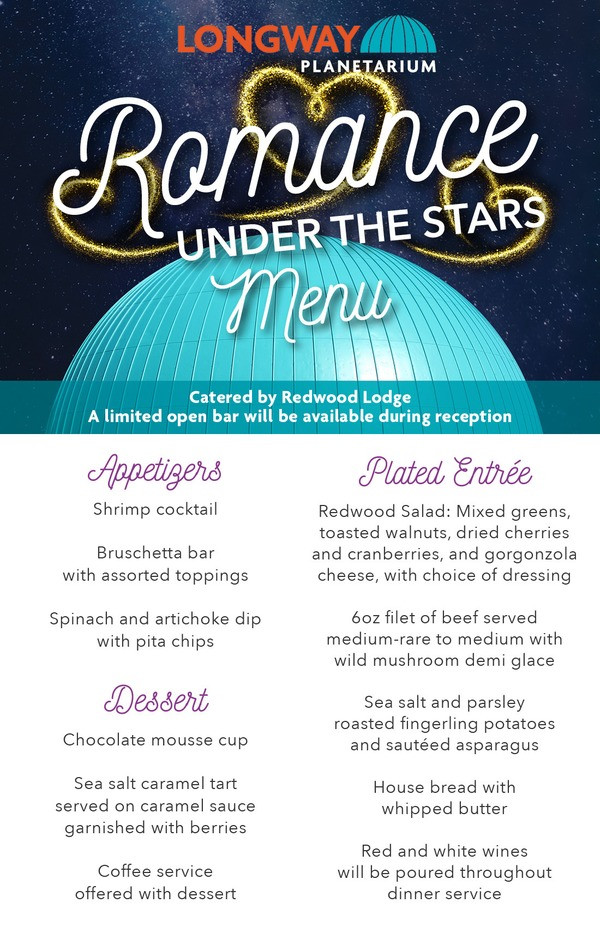 Romance Under The Stars at Longway Planetarium Enjoy an elegant night under the stars at Longway Planetarium. Start the evening off with drinks and appetizers, followed by a candlelit dinner inside the dome, catered by Redwood Lodge. For more information, call 810-237-3427.